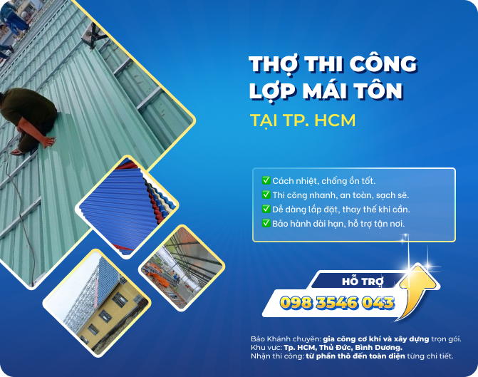Với kinh nghiệm nhiều năm trong lĩnh vực cơ khí, chúng tôi cam kết mang đến giải pháp lợp mái tôn đạt chuẩn kỹ thuật, chống dột 100% và thẩm mỹ cao. Đội ngũ thi công chuyên nghiệp, hỗ trợ tận nơi trong ngày giúp bạn yên tâm về chất lượng.
